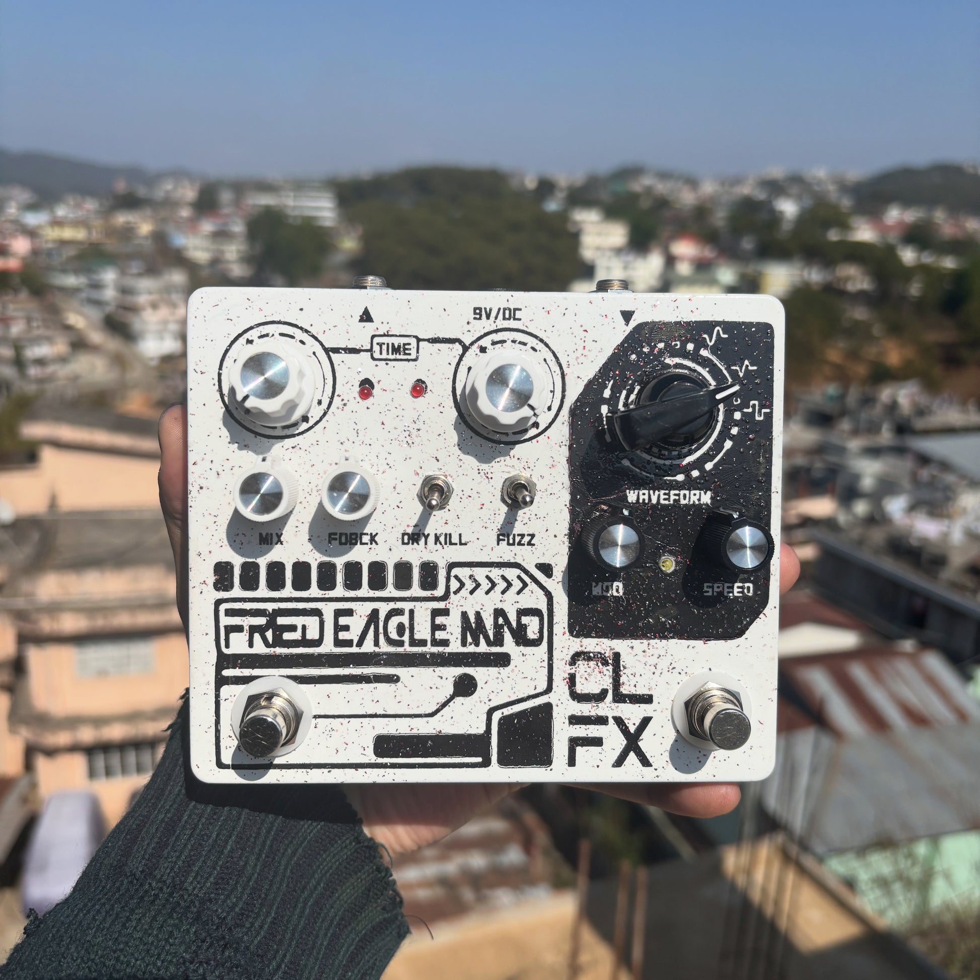 Fried Eagle Mind: Pt2399 delay. it has two time controls that you can use independently, so you can go from a short delay time to a long delay time, or vice versa, with just the push of a switch. It uses an ICL8038 function generator for the LFO with sine, triangle and square waveforms. It also has a switchable op amp fuzz before the delay and a dry kill switch. You can get a wide range of sounds with it, from a fuzzed-out shoegaze wash to metallic chorus cleans to lo-fi warped tape delays.
